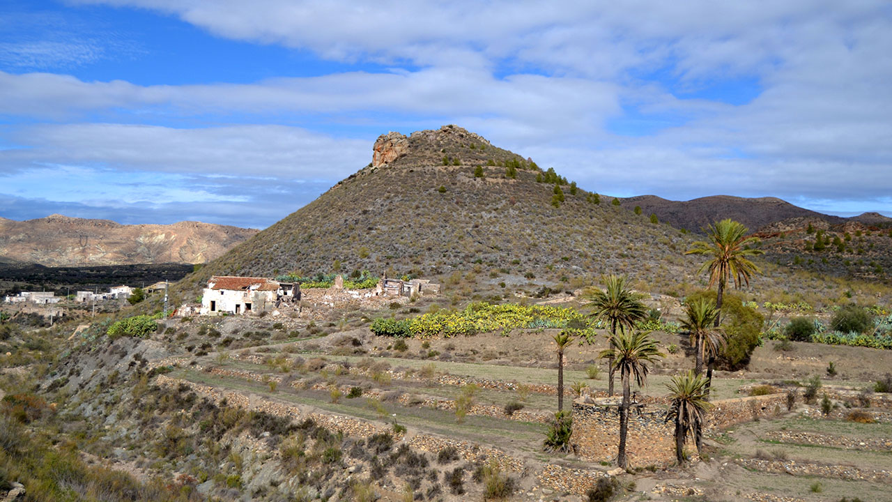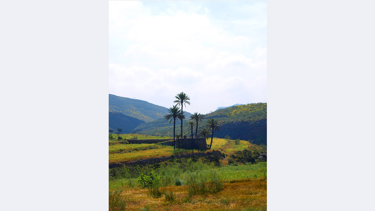 Junto a una montaña con aterrazamientos, palmeras y chumberas.